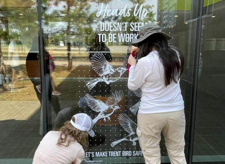 As part of our commitment to bird safety, Trent is installing window decal demonstration pieces from Feather Friendly. These bird-friendly window pieces will first be placed on front-facing windows in high-collision areas, such as the First Peoples House of Learning, Athletics Centre, and Science Complex.